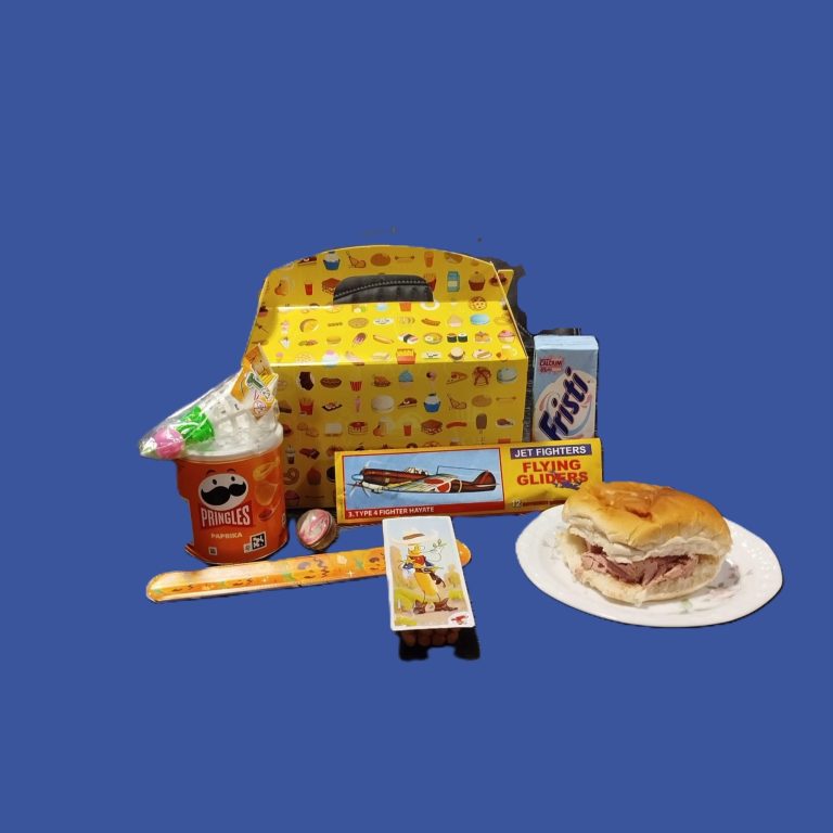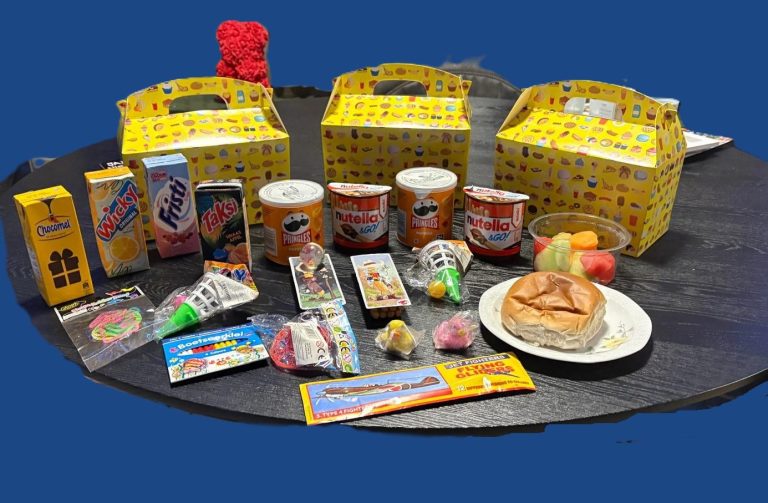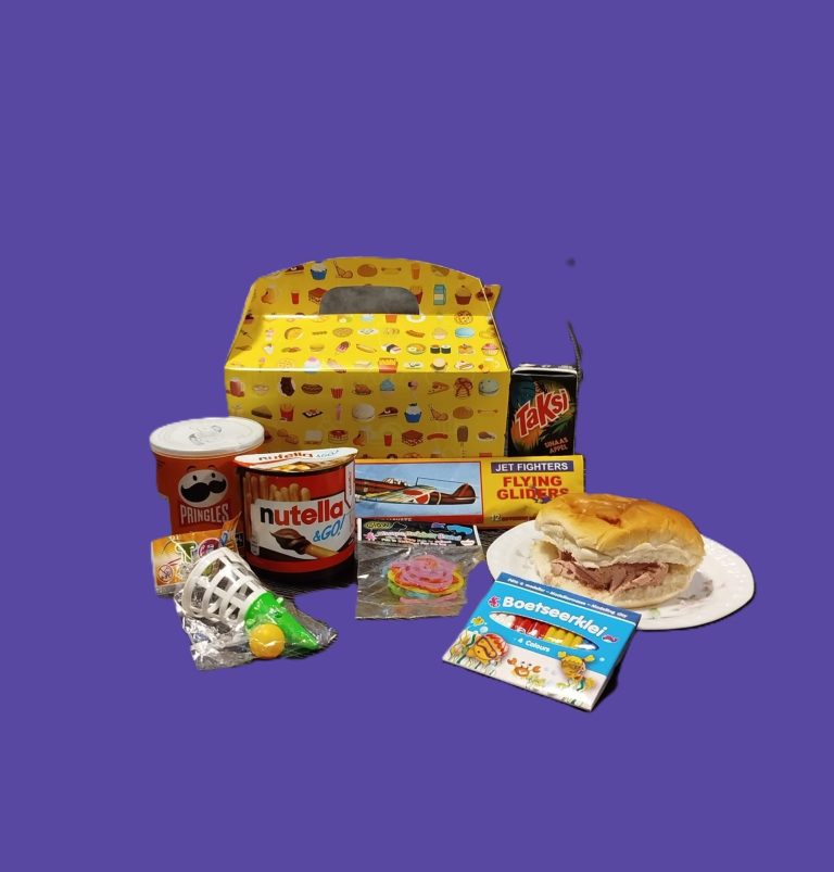 Gevuld met een belegd broodje, pakje drinken, Pringles, cheesedippers en een leuke verrassing