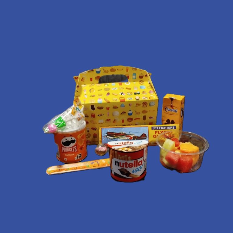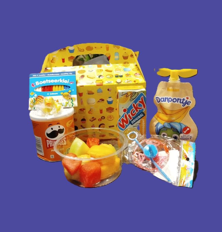 Gevuld met een bakje vers fruit, pakje drinken, Pringles, cheesedippers of Nutella & Go en een leuke verrassing